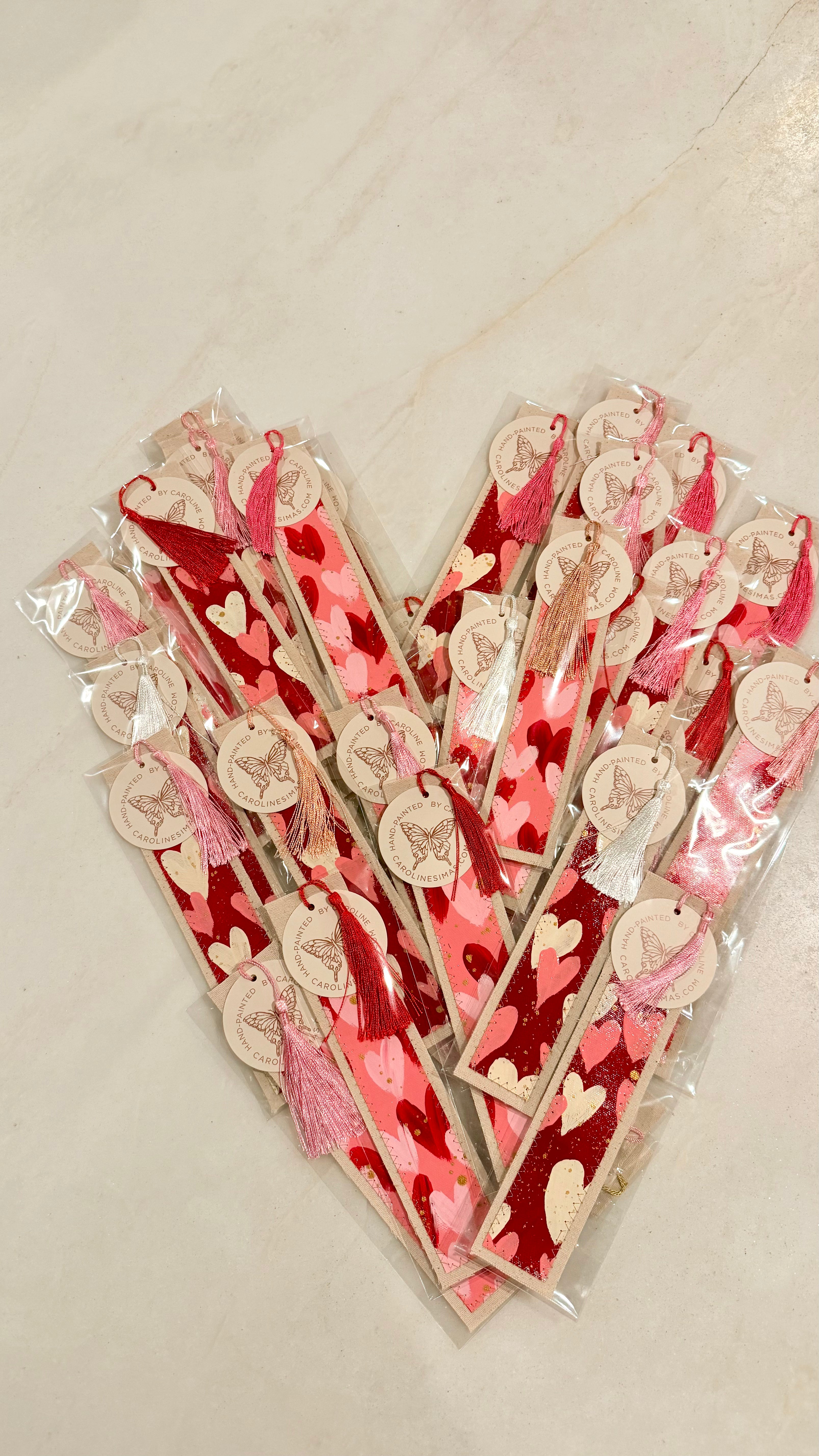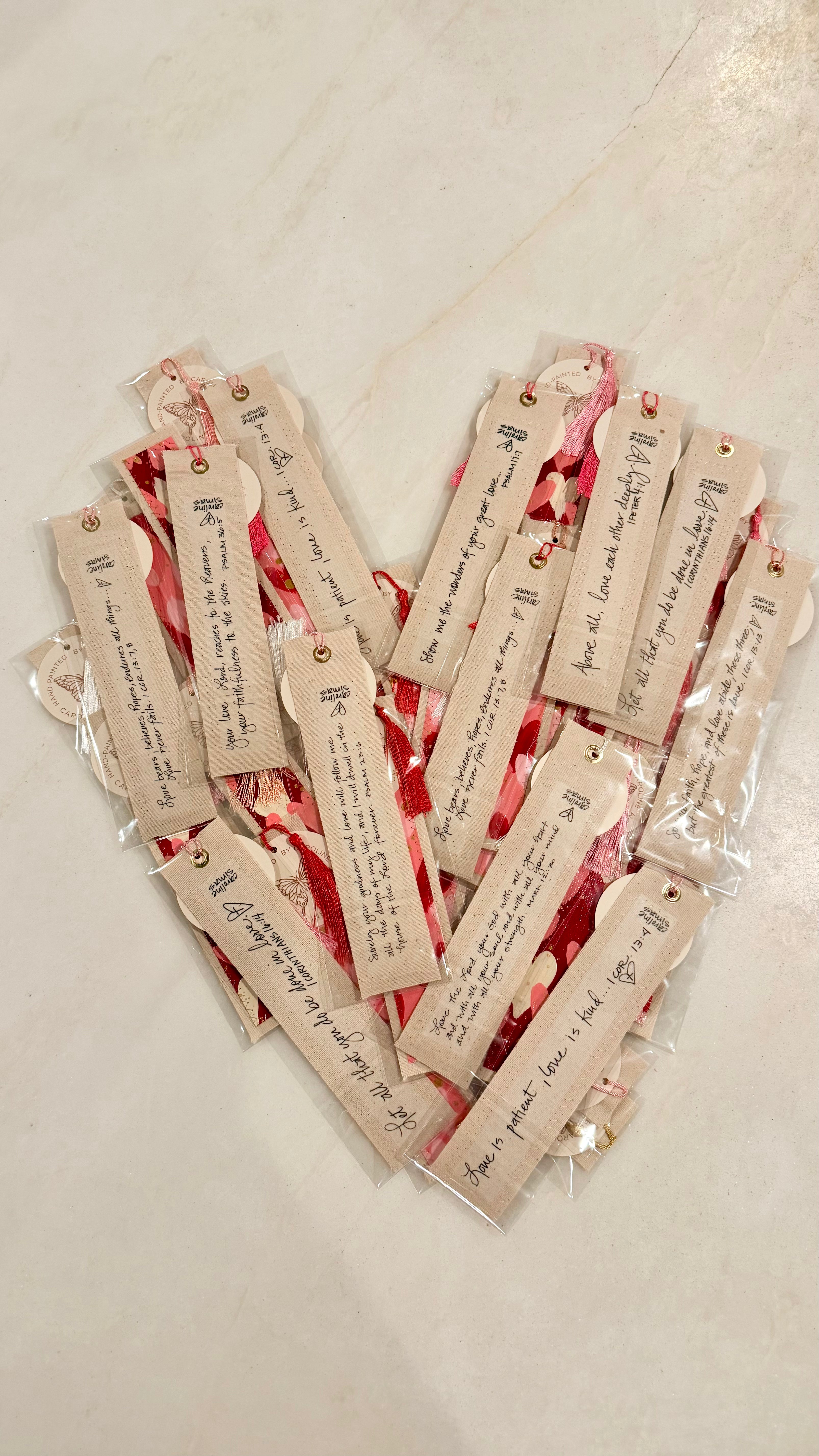 VALENTINE SCRIPTURE BOOKMARKS- with red and pink colors + verses relevant to LOVE. My hand-painted abstract canvas bookmarks are truly a labor of love! I hand-paint and varnish the canvas then they are carefully cut and sewn together using metallic gold thread. Next, scripture in my handwriting is ironed on the back and given a color coordinating tassel. Lastly tags are added with love. Individually packaged in clear sealed sleeve.